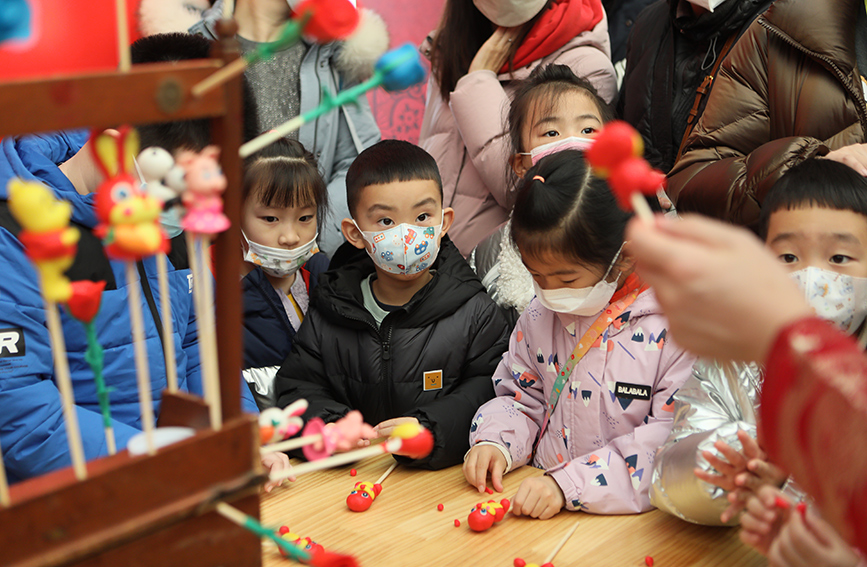 小朋友認(rèn)真觀看面人制作技藝。天津市少年兒童活動(dòng)中心供圖
