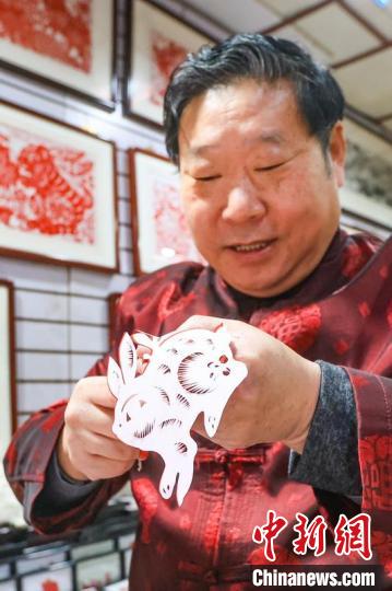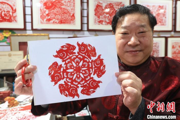 南京市工藝美術(shù)大師、非遺剪紙傳承人陳耀展示他創(chuàng)作的兔年剪紙作品。泱波 攝