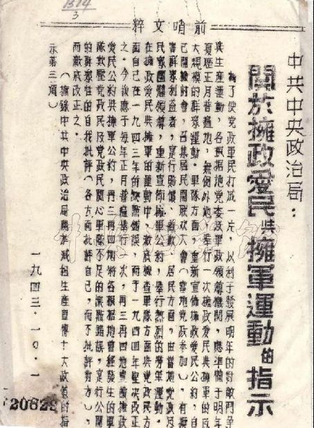 1943年10月1日,中共中央政治局頒布《關(guān)于擁政愛(ài)民與擁軍運(yùn)動(dòng)的指示》決定,以后每年的農(nóng)歷正月都要舉行一次擁政和擁軍的大規(guī)模群眾運(yùn)動(dòng)。