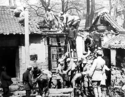 八路軍戰(zhàn)士為當(dāng)?shù)厝罕娦扪a(bǔ)房屋。