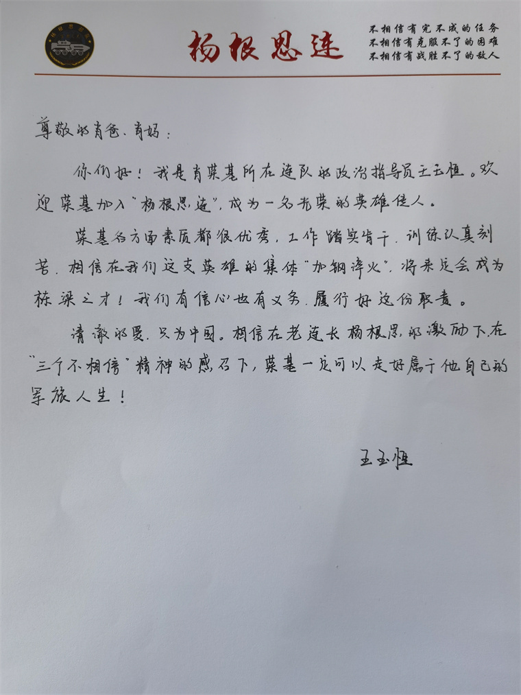 “爸媽,你們好!很榮幸能和榮基一起來到‘楊根思連’這個英雄集體,接下來我們會團結一心、共同成長?!?/p>