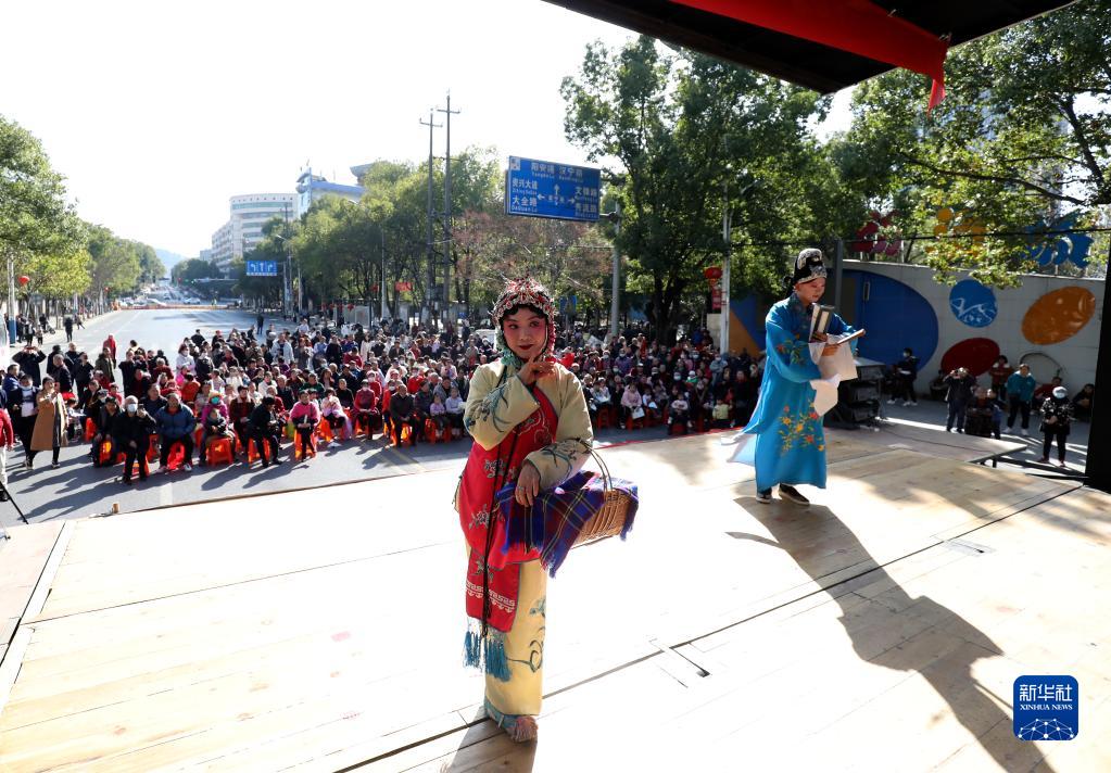 1月30日,在湖南省資興市人民廣場,演員在舞臺上進(jìn)行花鼓戲表演。