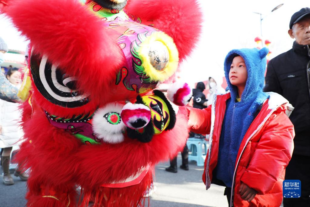 1月30日,在河北省唐山市豐潤區(qū)沙流河鎮(zhèn)皇親莊村,小朋友被舞獅表演吸引。