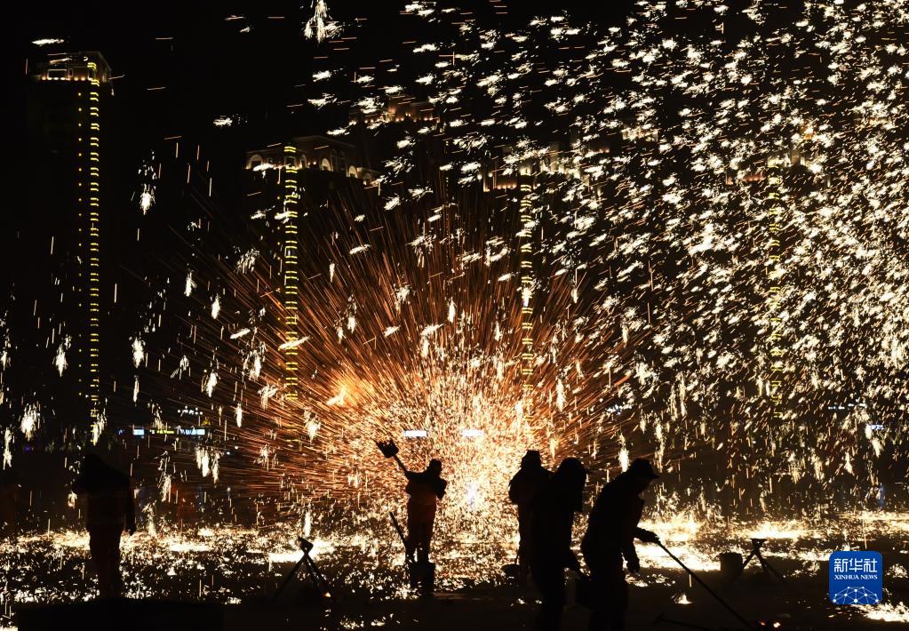 1月29日,藝人在甘肅省臨夏回族自治州永靖縣劉家峽鎮(zhèn)郁金香廣場表演“打鐵花”。