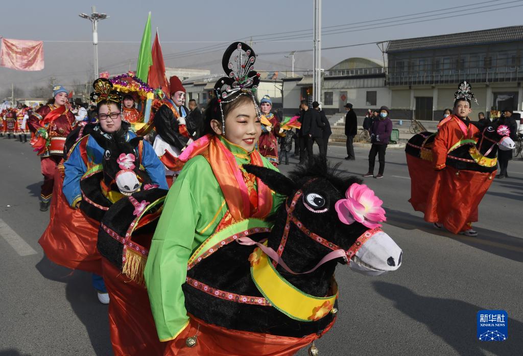 1月30日,在甘肅省臨夏回族自治州永靖縣太極鎮(zhèn),村民表演社火節(jié)目“騎毛驢”。
