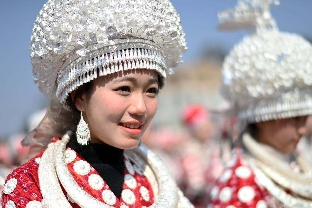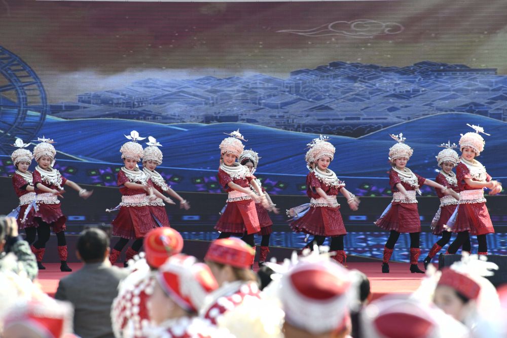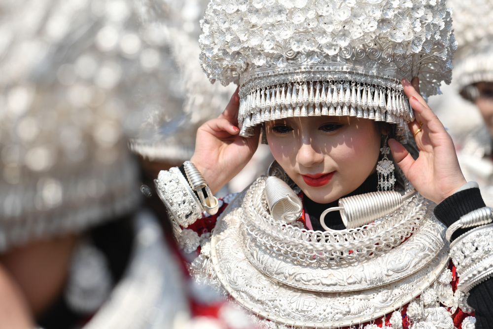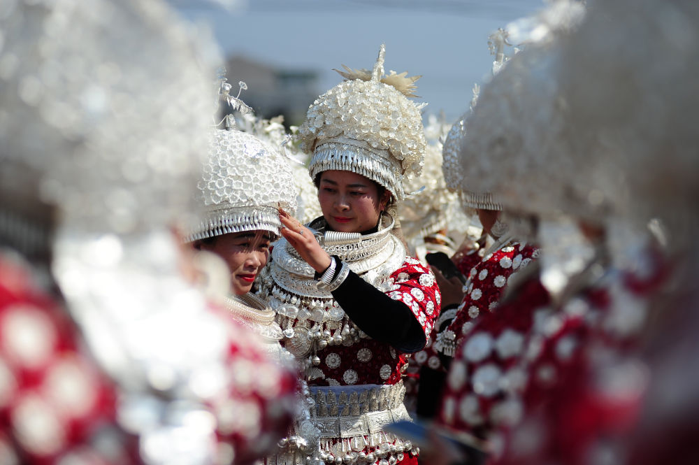 當(dāng)日,在貴州省黃平縣谷隴鎮(zhèn),26個(gè)村(居)的千余名苗族同胞身著銀飾盛裝,跳板凳舞、吹蘆笙、唱苗歌,載歌載舞喜迎元宵佳節(jié)。