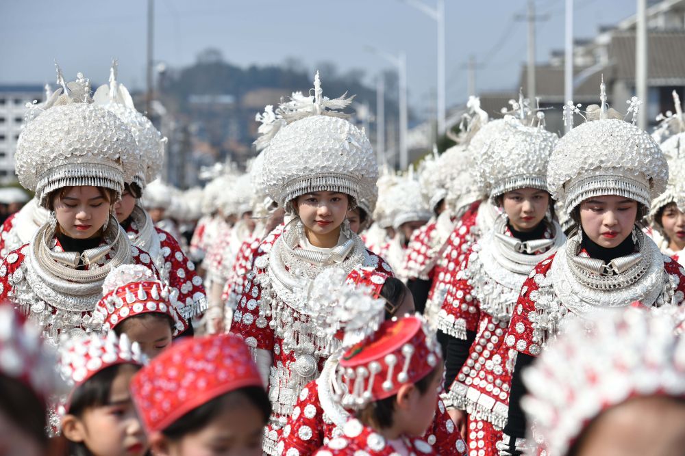↑1月31日,苗族同胞在貴州省黔東南苗族侗族自治州黃平縣谷隴鎮(zhèn)盛裝巡游。新華社發(fā)(潘鋒攝)