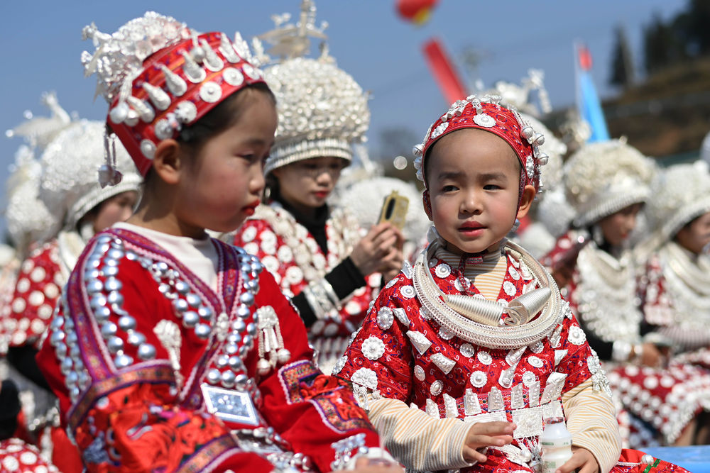 ↑1月31日,苗族小朋友在貴州省黔東南苗族侗族自治州黃平縣谷隴鎮(zhèn)觀看文藝演出。新華社記者 楊楹 攝