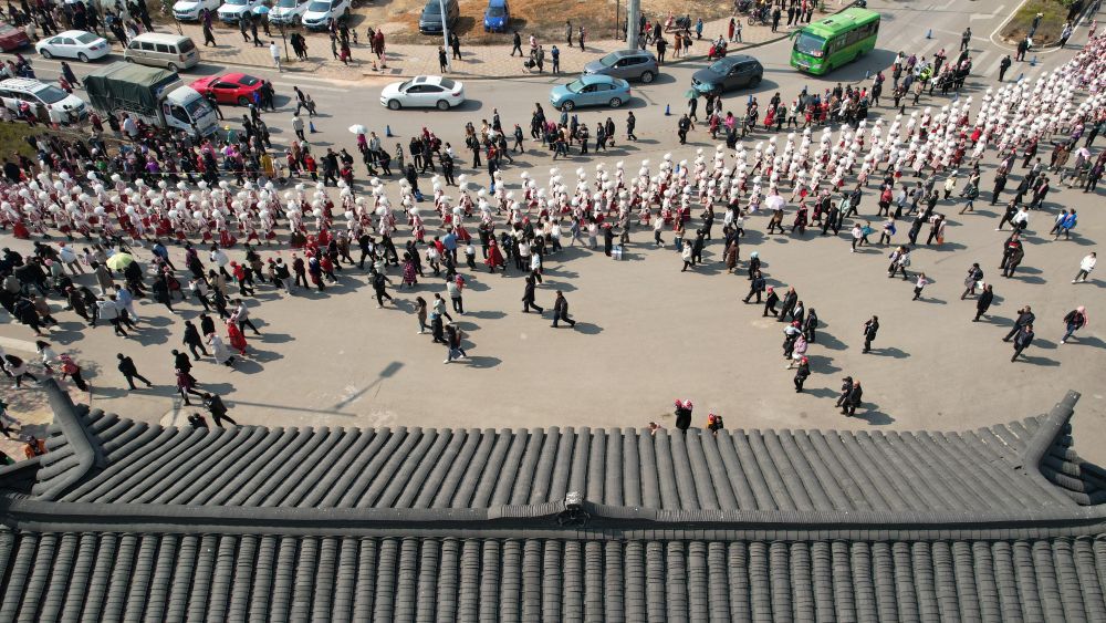 ↑1月31日,苗族同胞在貴州省黔東南苗族侗族自治州黃平縣谷隴鎮(zhèn)盛裝巡游(無(wú)人機(jī)照片)。新華社發(fā)(潘鋒攝)