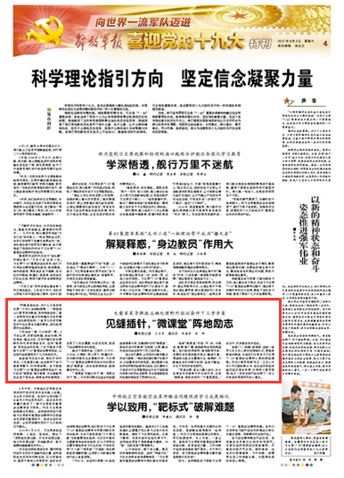 8月初以來,在野戰(zhàn)帳篷、流動車廂、待機庫房、偏遠點位,正執(zhí)行跨區(qū)駐訓演練任務(wù)的火箭軍某導彈旅官兵,運用“微課堂”靈活機動的優(yōu)勢,廣泛開展學習貫徹習主席“7·26”重要講話精神活動,以實際行動迎接黨的十九大勝利召開。請關(guān)注今天出版的《解放軍報》的報道: