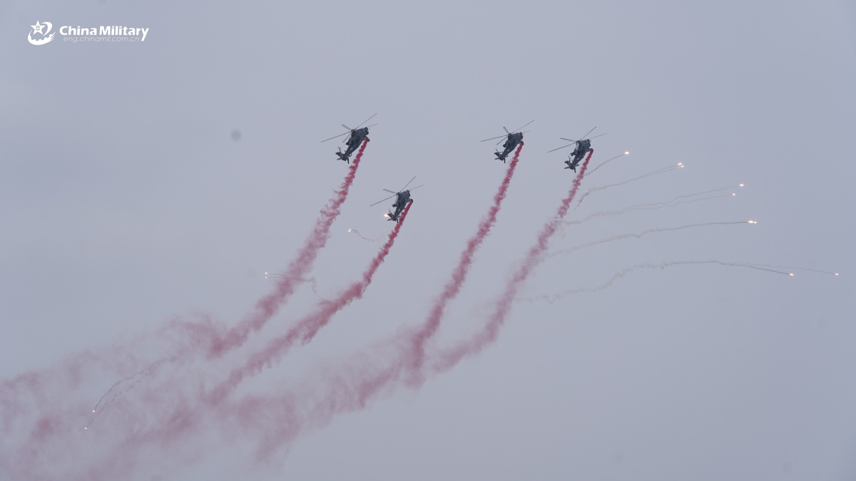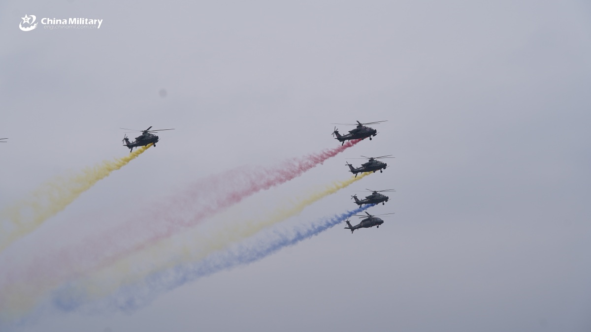 Z-10 attack helicopters attached to the Chinese PLA Army's Thunder Aerobatic Team perform aerobatic stunts in formation during the 7th China Helicopter Exposition on October 16, 2025. (eng.chinamil.com.cn)