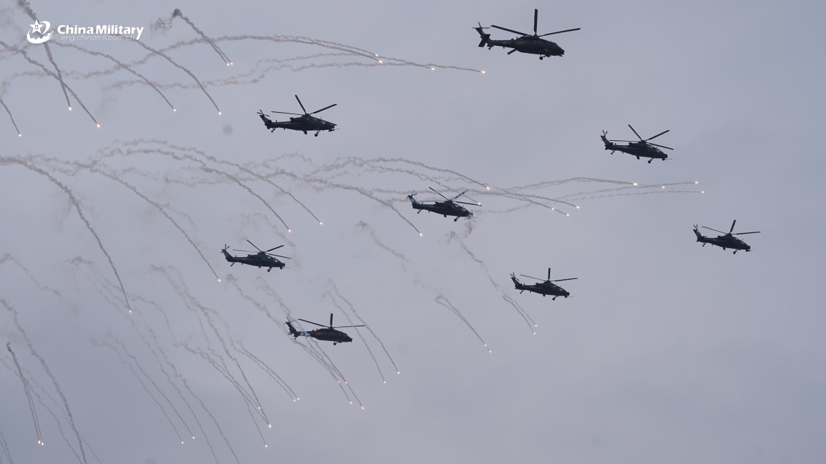 Z-10 attack helicopters and Z-20 utility helicopters attached to the Chinese PLA Army's Thunder Aerobatic Team fly in formation during the 7th China Helicopter Exposition on October 16, 2025. (eng.chinamil.com.cn)
