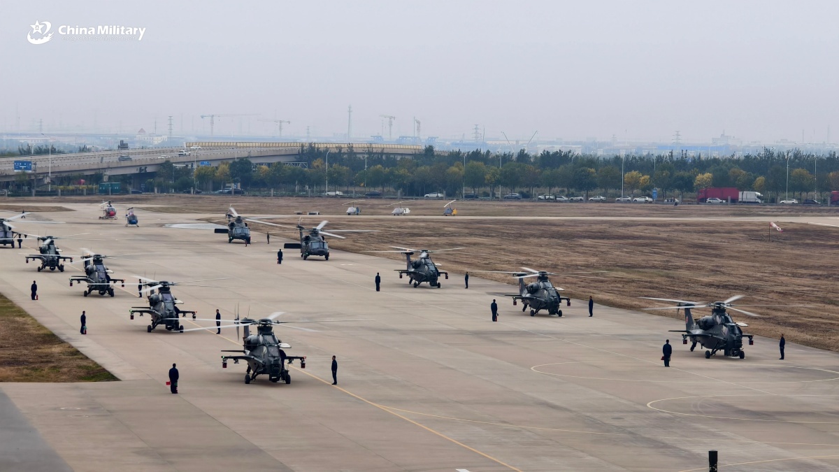 Z-10 attack helicopters and Z-20 utility helicopters attached to the Chinese PLA Army's Thunder Aerobatic Team are ready to take off for an aerobatics performance during the 7th China Helicopter Exposition on October 16, 2025. (eng.chinamil.com.cn)