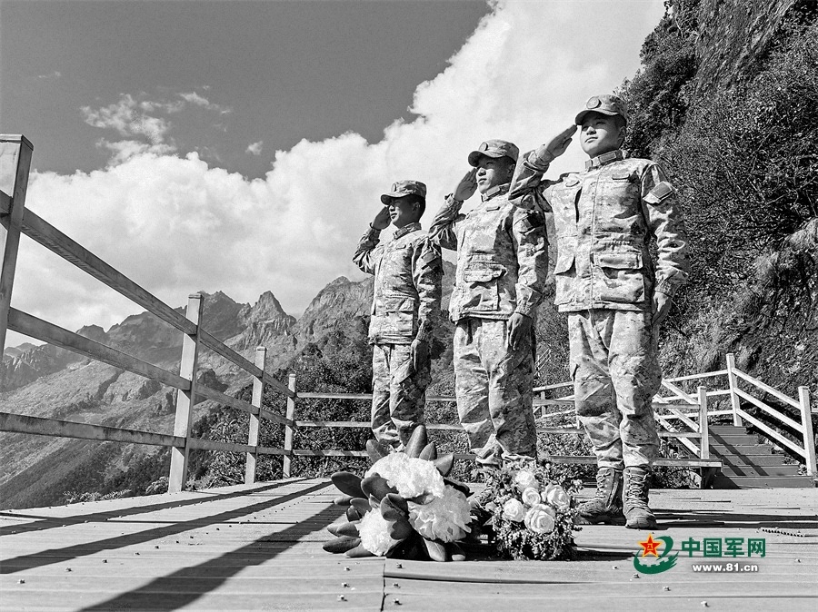 拉則拉哨所官兵在胡永飛犧牲的路段擺上鮮花,向英雄敬禮。