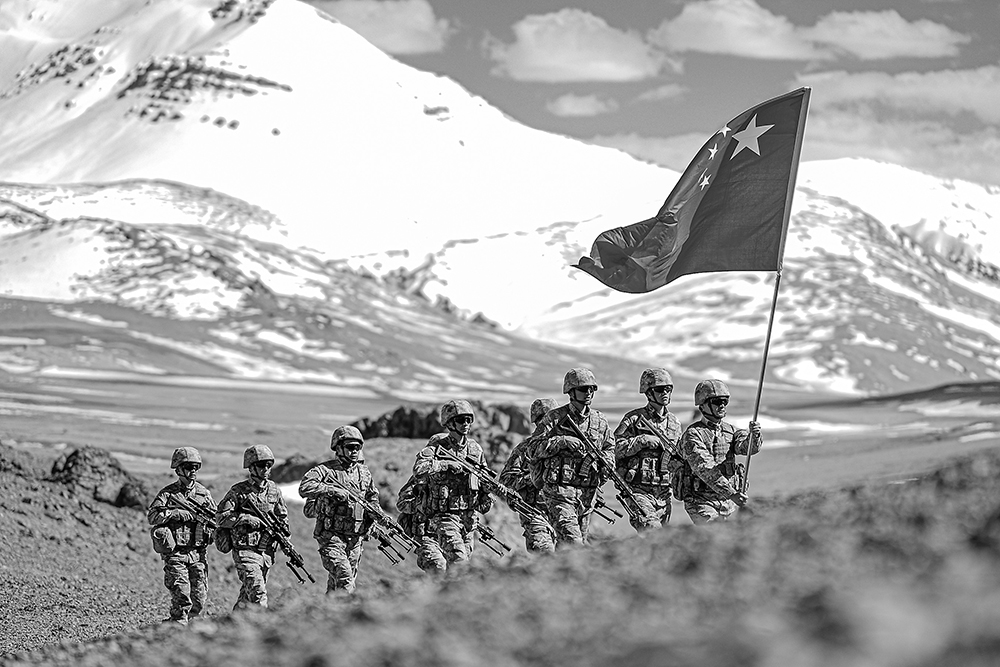 下士席云海只覺(jué)得肺像要炸開(kāi),但腳步不敢慢下,他緊跟著前面的戰(zhàn)友,沖向那片巨大的巖石區(qū)。剛剛完成隱蔽,濃云吞噬了頭頂?shù)乃{(lán)天,山風(fēng)變得又急又冷,帶著刺骨的寒意。緊接著,冰雹砸在巖石和頭盔上,發(fā)出“噼噼啪啪”的聲響。一塊冰粒子順著席云海的脖頸滑落,他不禁打了個(gè)寒戰(zhàn)?!罢媸翘嵘裥涯X。”他向一旁的戰(zhàn)友頑皮地說(shuō)道。