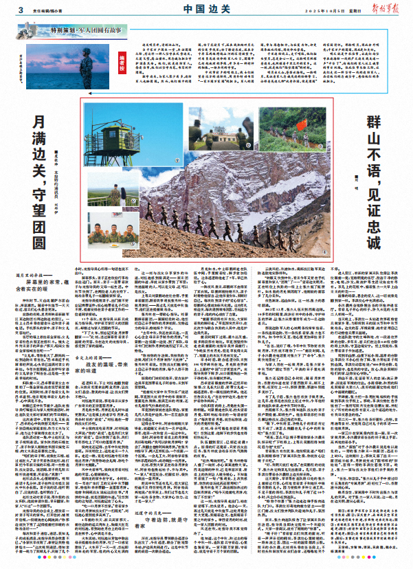 他知道,這個(gè)中秋,和過去的每個(gè)中秋一樣,連隊(duì)官兵守著邊,心里也裝著家。一家不圓萬家圓,守著邊,就是守著千萬個(gè)家的團(tuán)圓。