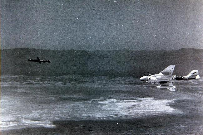 美國(guó)EA-6電子戰(zhàn)機(jī)跟隨一枚飛行中的戰(zhàn)斧巡航導(dǎo)彈。