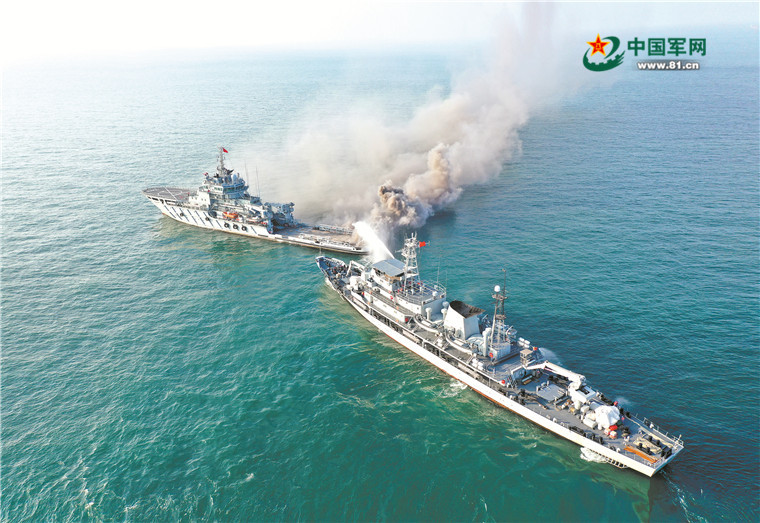 打撈救生船對(duì)“戰(zhàn)損”艦艇實(shí)施滅火救援