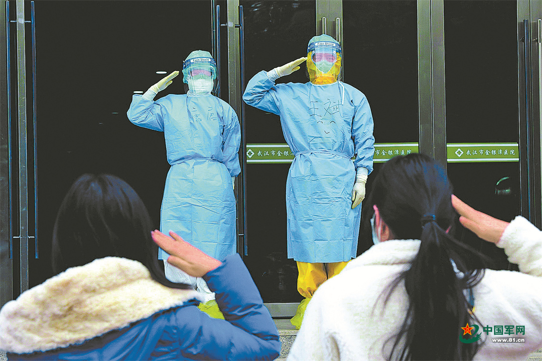 2020年,新冠肺炎疫情暴發(fā),軍隊(duì)支援湖北醫(yī)療隊(duì)緊急奔赴一線抗疫。圖為兩名康復(fù)者向軍隊(duì)醫(yī)護(hù)人員敬禮致謝。