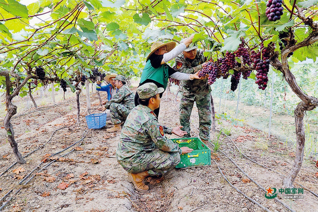 大暑時(shí)節(jié),安徽省合肥市包河區(qū)人武部組織民兵助農(nóng)小分隊(duì)走進(jìn)當(dāng)?shù)仄咸逊N植基地,幫助果農(nóng)采收。顧維巍 攝