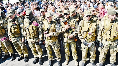 8月26日,在烏克蘭基輔,錫奇特別志愿軍的士兵參加宣誓和告別儀式。他們將要前往烏克蘭東部打擊民間武裝。新華社發(fā)?