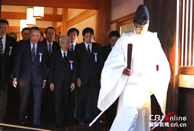 當?shù)貢r間2014年10月17日,日本東京,靖國神社舉行為期3天的秋季例行大祭活動,日本100多名“大家都來參拜靖國神社國會議員之會”的成員參拜了靖國神社。目前身處意大利的日本首相安倍晉三則供奉了祭品。