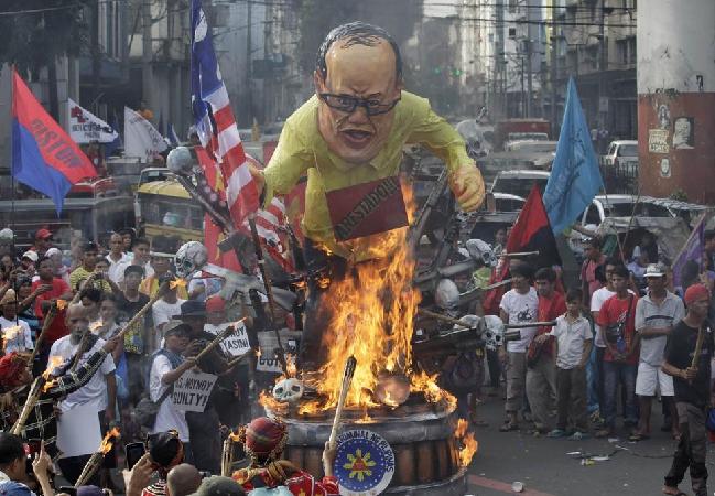 當(dāng)?shù)貢r(shí)間2014年12月10日,菲律賓首都馬尼拉,世界人權(quán)日,示威者聚集在總統(tǒng)府外,焚燒一座高達(dá)4.3米的菲律賓總統(tǒng)阿基諾雕像,以抗議政府對侵犯人權(quán)行為的不作為。