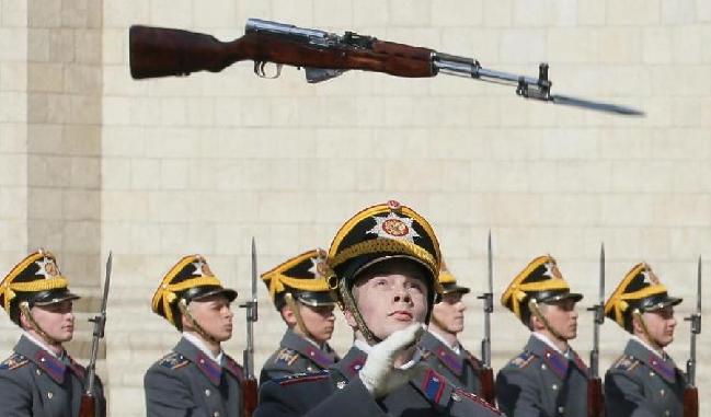 圖為守衛(wèi)克里姆林宮的總統(tǒng)衛(wèi)隊(duì)士兵在進(jìn)行換崗儀式。Mikhail Metzel 攝