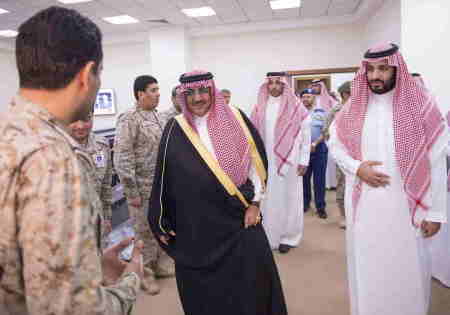 3月25日,沙特副王儲(chǔ)兼第二副首相和內(nèi)政大臣穆罕默德·本·納伊夫(前右二)和國(guó)防大臣穆罕默德·本·薩勒曼(右一)抵達(dá)位于沙特南部和也門(mén)接壤的戰(zhàn)斗指揮中心。