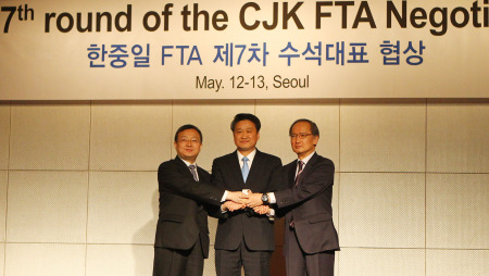 5月12日,在韓國(guó)首爾,(從左到右)中國(guó)談判代表王受文、韓國(guó)談判代表金學(xué)道和日本談判代表長(zhǎng)嶺安政合影。