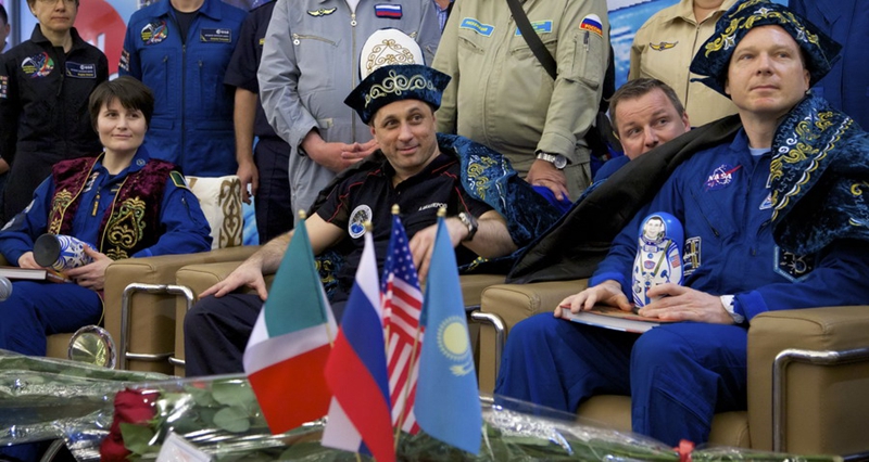 6月11日,在哈薩克斯坦的卡拉干達,意大利宇航員薩曼莎·克里斯托弗雷蒂(左)、俄羅斯宇航員安東·什克普列羅夫(中)和美國宇航員特里·維爾特斯身著哈薩克傳統(tǒng)服飾參加歡迎儀式。 新華社/法新