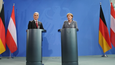 9月15日,在德國首都柏林,奧地利總理法伊曼(左)與德國總理默克爾共同出席新聞發(fā)布會。當(dāng)天,法伊曼訪問德國,與默克爾商討共同應(yīng)對難民危機(jī)的措施。 新華社記者 郭洋 攝