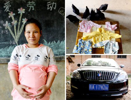 右圖下:因為家處偏遠村莊,聶中花和丈夫貸款買了一輛小轎車,以便到市中心就醫(yī),更能方便寶寶將來的生活(拼版照片,5月7日攝)。