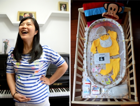 右圖:曾惜將每一階段的胎兒B超圖保存下來,記錄寶寶在肚子里成長的每一步。搖籃床上的黃色毛衣是曾惜在婆婆幫忙下手工織就的,尿片和嬰兒護理清潔劑等用品則來自網(wǎng)購(拼版照片,5月9日攝)。