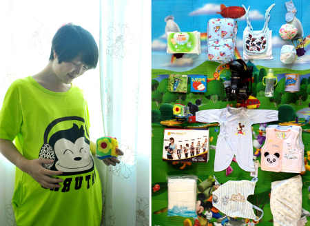 右圖:韋秀玲為將要出生的孩子準(zhǔn)備了衣服、奶瓶、奶粉、紙尿褲、抱毯、小玩具、書籍、枕頭、爬行墊等,幾乎全部購自網(wǎng)絡(luò)(拼版照片,5月8日攝)。