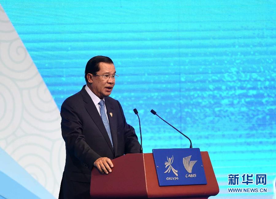 9月16日,柬埔寨首相洪森在開幕式上演講。 9月16日,第十一屆中國(guó)—東盟博覽會(huì)在廣西南寧開幕。 新華社記者 黃孝邦 攝