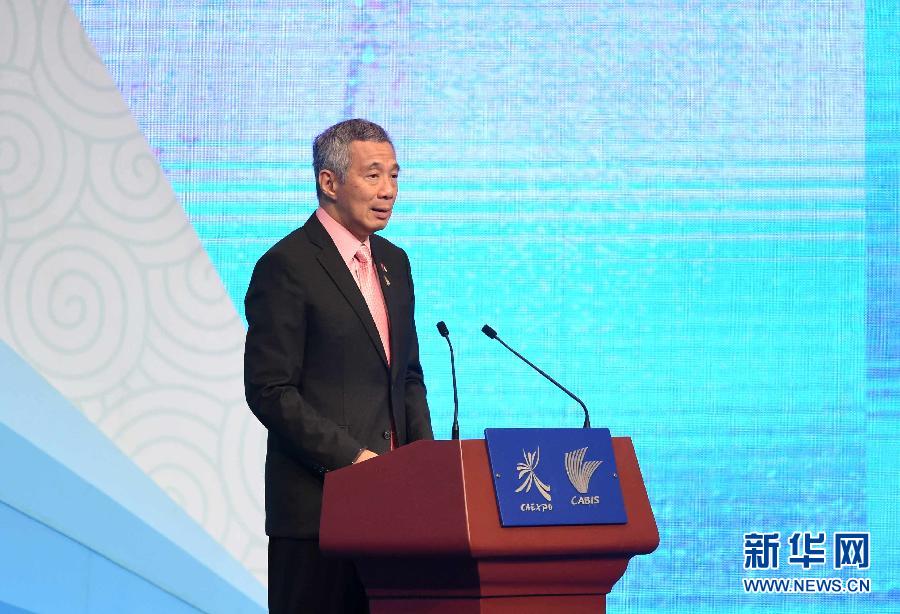9月16日,新加坡總理李顯龍?jiān)陂_(kāi)幕式上演講。 9月16日,第十一屆中國(guó)—東盟博覽會(huì)在廣西南寧開(kāi)幕。 新華社記者 黃孝邦 攝