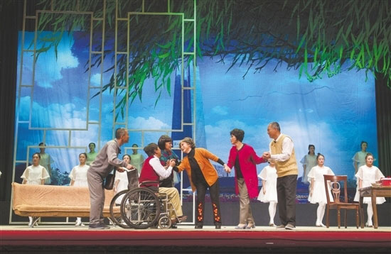 姚劇《浪漫村莊》即以一座小村莊、一位支農(nóng)小干部、一個幾經(jīng)流離輾轉(zhuǎn)的吻反映出了農(nóng)村城鎮(zhèn)生態(tài)保護與農(nóng)民致富、百姓個人幸福生活之間有機的辯證關(guān)系?;鼞颉兑荒钪睢芬惨詭讉€鮮活典型的藝術(shù)形象,充分展開了當(dāng)門對戶、相鄰而居的兩個家庭之間錯綜復(fù)雜的關(guān)系,借通俗幽默的一個接一個的“小誤會”揭示出大千社會的眾生相以及犄角旮旯的點點滴滴,從而映射出應(yīng)普遍警惕的防腐反貪主題。評劇《喊一聲媽媽》以唐山大地震之后一位組合家庭的后媽為核心,寫出了這位母親從震后到重建的幾十年風(fēng)雨人生。區(qū)別于一般宣教劇的過分“求真”,掙脫出完全復(fù)制式的生活真實的束縛,該劇有效縮短了“事跡”與“藝術(shù)”之間、“求真”與“求美”之間的距離,獲得了較好的舞臺呈現(xiàn)效果,在一定層面上實現(xiàn)了主題的藝術(shù)化發(fā)酵與升華,做到了以情動人?;ü膽颉秲捍笈蟆穭t揀選了社會一度熱議的農(nóng)村老人黃昏戀、“啃老”“養(yǎng)老”等問題一并展開,直接而夸張地放大了農(nóng)村生活的新矛盾,毫不留情地鞭撻了時代大潮中傳統(tǒng)美德淪喪的假、惡、丑。