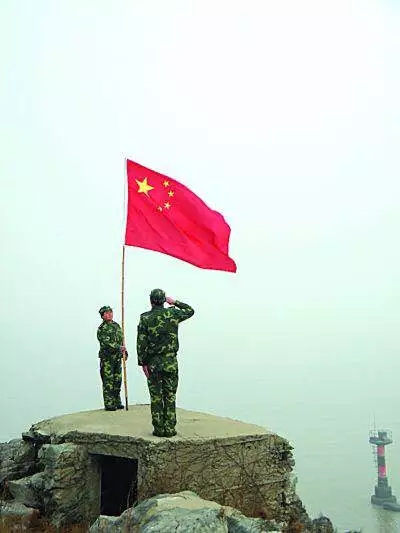 2016年“五一”,開山島上的第30個勞動節(jié),我再次上島,島上營房的門上多了副對聯(lián):“甘把青春獻國防,愿將熱血化丹青?!蓖趵^才樂呵呵地說是自己專門找人寫的。島上的旗桿被海風吹壞了,他急壞了,哪里顧得上睡覺,連夜修好旗桿。我問他:“沒人要求,沒人監(jiān)督,沒有人看,你為什么還要這么較真?”“開山島雖然小,但它是祖國的東門,我必須插上中華人民共和國國旗?!蓖趵^才轉(zhuǎn)過身子對我說,“只有看著國旗在海風中飄揚,才覺著這個島是有顏色的。”我忘不了他當時的認真和他眼中溢滿的深情和堅定,可這一次,老王升旗時沙啞卻響亮的“敬禮”聲卻再也聽不到了。