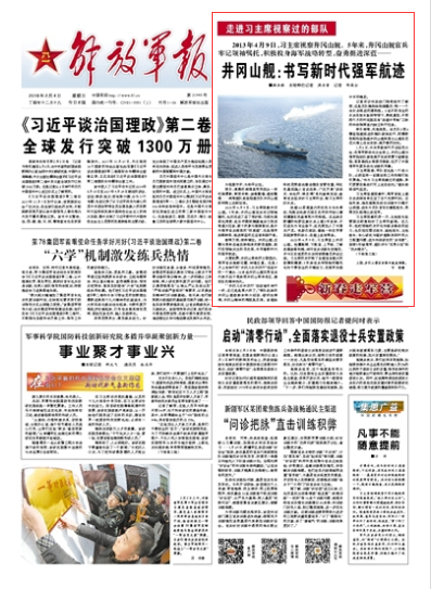 2013年4月9日,習(xí)主席視察井岡山艦。5年來(lái),井岡山艦官兵牢記領(lǐng)袖囑托,先后完成了亞丁灣護(hù)航、馬航失聯(lián)客機(jī)搜救、赴吉布提保障基地兵力投送等重大任務(wù),數(shù)十次參與聯(lián)演聯(lián)訓(xùn),是中外海軍官兵眼里的“明星艦”,也是海軍戰(zhàn)略轉(zhuǎn)型、挺進(jìn)深藍(lán)的見(jiàn)證者和踐行者。請(qǐng)關(guān)注今日出版的《解放軍報(bào)》的文章——