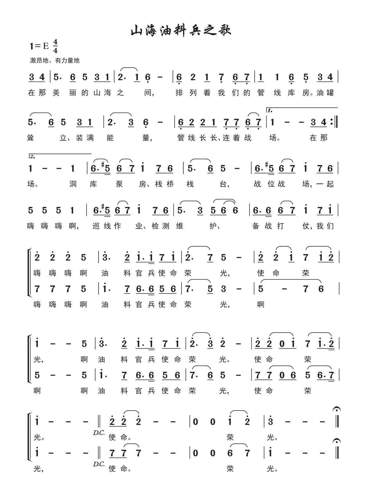 宋澤東第一次聽到這首歌,是在去單位報到的路上。當時剛剛完成新兵訓練的他對未來充滿好奇,詢問同車的干事韓良:“單位是個什么樣的地方呀?”韓良把《山海油料兵之歌》的MV視頻轉發(fā)給他,說可以從中窺得一二。熱情的旋律、唯美的畫面讓宋澤東心潮澎湃,對即將到來的新生活充滿憧憬。