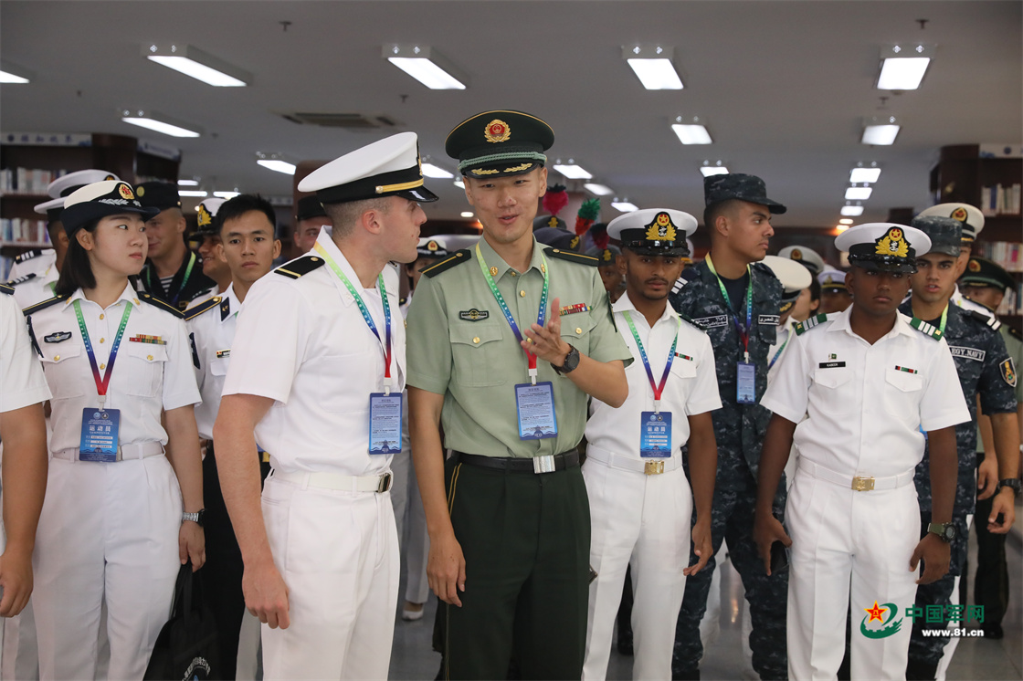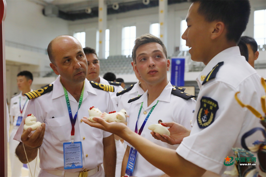 各個(gè)國家參賽隊(duì)隊(duì)員在海軍潛艇學(xué)院文化俱樂部參觀交流傳統(tǒng)文化。畢笑天 攝