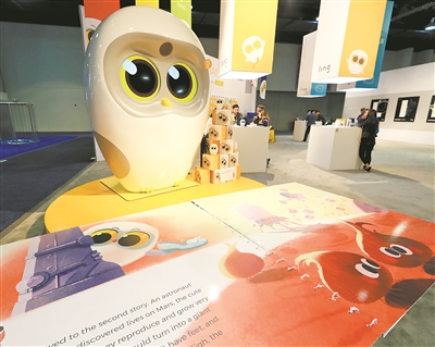 上圖:2018年拉斯維加斯消費電子展于當?shù)貢r間1月9日開幕,來自中國的各類新型科技產(chǎn)品閃耀會場。這是10日展示的可為兒童朗讀繪本的機器人Luka。