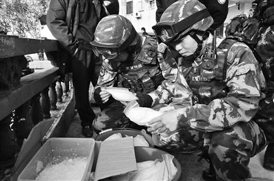 上圖:武警廣東總隊(duì)官兵在雷霆出擊掃毒抓捕行動(dòng)后,清點(diǎn)繳獲毒品。
