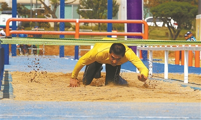 上圖:2014年,中國(guó)隊(duì)選手宮國(guó)寶參加軍事五項(xiàng)世錦賽男子500米障礙接力賽。新華社發(fā)