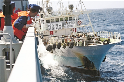 盡管如此,我們?nèi)匀豁斨?米高的大涌大浪搭起補(bǔ)給通道。當(dāng)?shù)谝桓|繩將軍艦和漁船連到一起時(shí),在場官兵發(fā)出陣陣歡呼。隨后,我們把燃油、藥品、衣物和艦上所剩不多的牛奶、罐頭、湯圓送到漁船上。