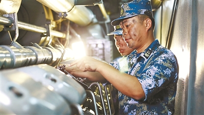 圖②:王東帶領(lǐng)人員修理柴油機(jī)。