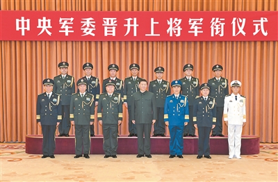 晉銜儀式在嘹亮的軍歌聲中結(jié)束。隨后,習(xí)近平等領(lǐng)導(dǎo)同志同晉升上將軍銜的軍官合影。