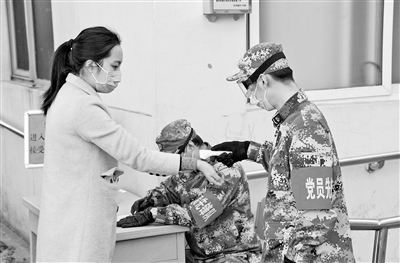 執(zhí)行疫情防控任務(wù)時,海軍某直屬保障大隊汽車勤務(wù)隊組成“防疫黨員先鋒隊”,堅持在一線開展工作。圖為黨員曹丁為來隊官兵家屬測量體溫。戚一凡攝