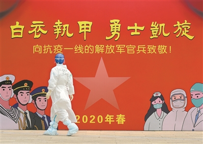 上圖:4月5日,在武漢泰康同濟(jì)醫(yī)院,護(hù)送一名新冠肺炎治愈患者出院后,軍隊支援湖北醫(yī)療隊隊員葉洪江從院區(qū)內(nèi)的展板前走過返回病房。